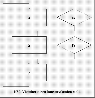 Tässä mallissa määräytyy siis paitsi kulutus tulojen perusteella, myös toisensuuntainen vaikutus eli se, miten tulot riippuvat kulutuskysynnästä. Tämä kansantalouden malli on esitetty lohkokaaviona kuviossa K8.1.